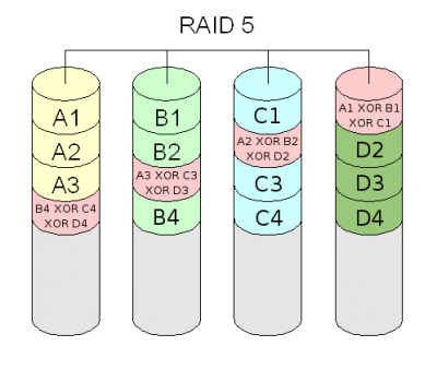 Die Daten, aber auch die Parität, werden auf alle Festplatten verteilt. Die Berechnung der Parität erfolgt durch die XOR-Verknüpfung.