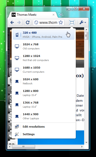 Etwas ähnliches ließe sich unter Firefox wahrscheinlich mit den Add-ons User Agent Switcher und Firesizer auch einrichten. Dies habe ich allerdings noch nicht getestet.