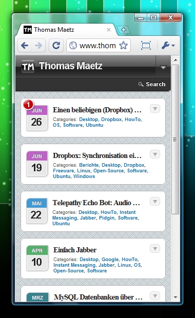Google Chrome bzw. Chromium bietet sich dabei als Browser an, da er, wie viele mobile Browser (iPhone, Android und webOS), WebKit verwendet. Die portable Version von Google Chrome, die man hier herunterladen kann, erweist sich dabei als vorteilhaft, weil man sie schnell auf den aktuellsten Chromium Build aktualisieren kann und beim Testen nicht die lokale Installation verändert.