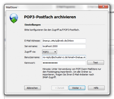 deine eigene email-adresse, die du bei SVZ benutzt benutzen.Ich habe das PlugIn vor zwei-drei Jahren auf einem WinXP PC schonmal durchlaufen lassen. Da hatte ich zwar auch das Problem, dass nur 960 oder 1000 meiner Nachrichten archiviert wurden, doch es funktionierte. Jetzt probiere ich mich seit gestern wieder mit dem PlugIn... Aber es klappt gar nicht. Nur Fehlermeldungen vom MailStore. (Damals hatte ich Thunderbird benutzt..., was ich jetzt aber nicht mal mehr passend konfiguriert bekomme).