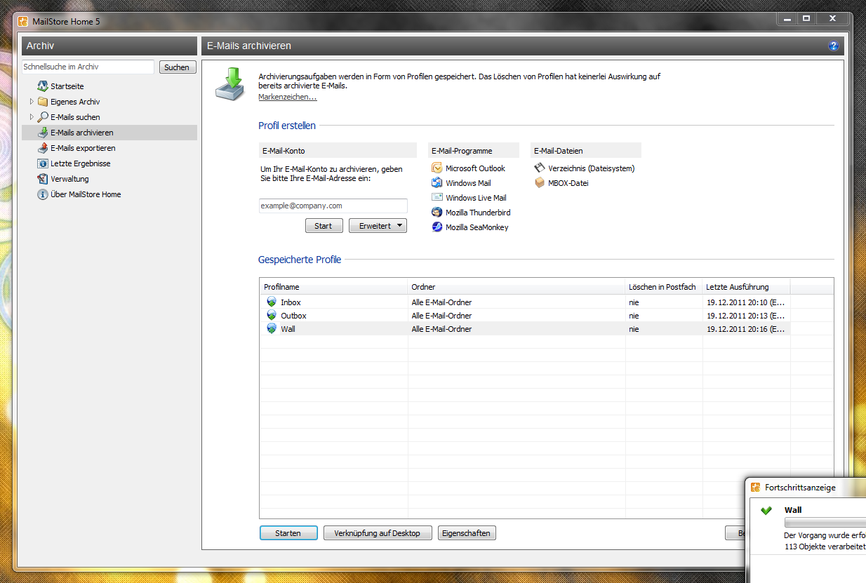 Nachdem alle Komponenten installiert sind, startet man FreePOPs sowie MailStore Home und fügt zunächst eine neue Archivierungsaufgabe hinzu. Dies erfolgt in Form eines Profils mit den folgenden Einstellungen: