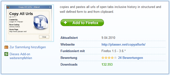 Mit einem Klick werden die Links aller Tabs des jeweiligen Fensters in die Zwischenablage kopiert, wobei als Formatierungsoptionen sowohl reiner Text, als auch HTML, zur Verfügung stehen.