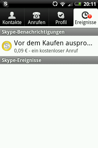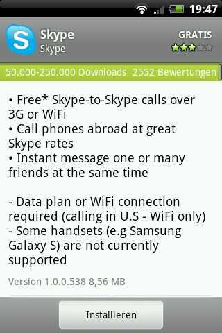 Auf meinem HTC Hero lief die Anwendung zeitweise nicht stabil und durch den sehr hohen Speicherverbrauch musste ich sie leider erst mal wieder deinstallieren. Ich werde das Ganze aber im Auge behalten, da mir Skype für Android ansonsten sehr gut gefällt und die Sprachqualität bei meinem Test seht gut war.
