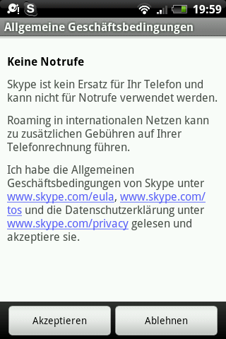 Videotelefonie ist leider noch nicht möglich, was derzeit aber auch nicht so tragisch ist, da die meisten Smartphones sowieso nicht über eine Front-Kamera verfügen. Im Ausland sollte man auf die Skype-Nutzung in 3G-Netzen möglichst verzichten, da ansonsten sehr hohe Roaming-Gebühren anfallen. Meldet man sich über einen WLAN-Hotspot an besteht dieses Problem natürlich nicht.