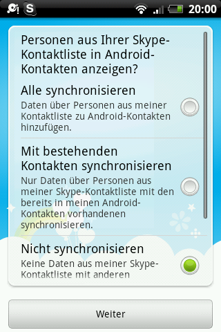 Zur Installation der 8,56 MB großen Anwendung wird Android 2.1 oder höher empfohlen. Die Skype-Kontakte werden anschließend in die Kontaktliste integriert. Praktisch ist die Tatsache, dass man sich in einen Skype-Account von mehreren Standorten aus gleichzeitig anmelden kann. Es ist somit möglich am Desktop online zu sein und sich bei Bedarf mit dem Smartphone anzumelden. Die Kontaktliste ist dabei überall synchronisiert.