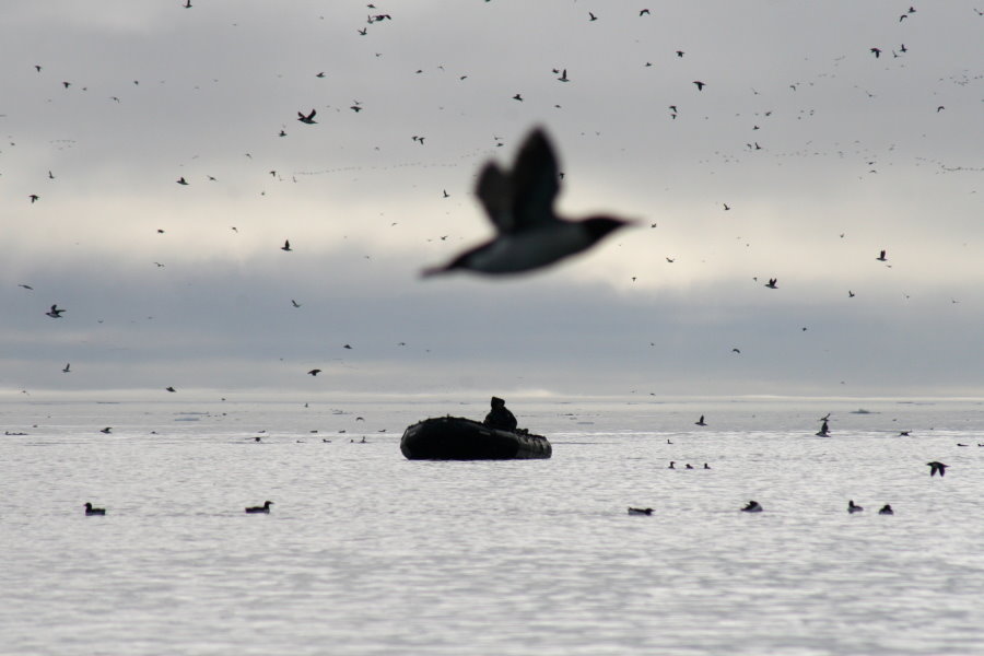 Die Sprechanlage des Expeditionsschiffes quäkt und eine bekannte Stimme ist zu hören. Der chilenische Expeditionsleiter Julio verkündet die Sichtung eines Eisbärs auf der Steuerbordseite des Schiffes. Plötzlich ist nichts wie zuvor, alle Reisenden, die sich zu diesem Zeitpunkt im Speisesaal befinden, springen auf, greifen zur Kamera und rennen an Deck. Jeder versucht, den Wettlauf um das erste Foto zu gewinnen. Oben angekommen, eröffnet sich der Blick auf eine kleine, vom Nebel umgebene Insel am Eingang zum Smeerenburgfjord und bei genauem Hinsehen wird allen klar, dass der weiße Punkt dort tatsächlich ein Eisbär ist. Dieser geht ungeachtet vom Klicken der Auslöser weiter seines Weges und verschwindet nach ein paar Minuten so schnell, wie er aufgetaucht war.